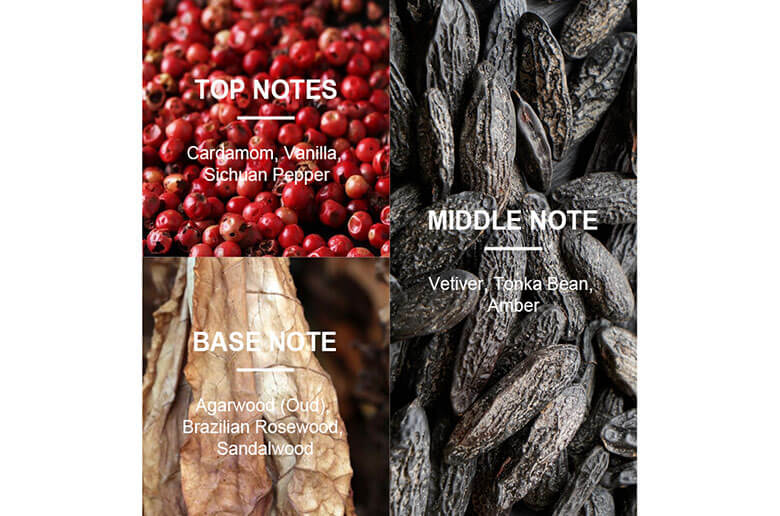 后調(diào):煙草 沉香(烏木) 檀香木 焚香 廣藿香 安息香脂 香草 雪松