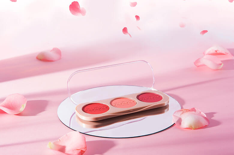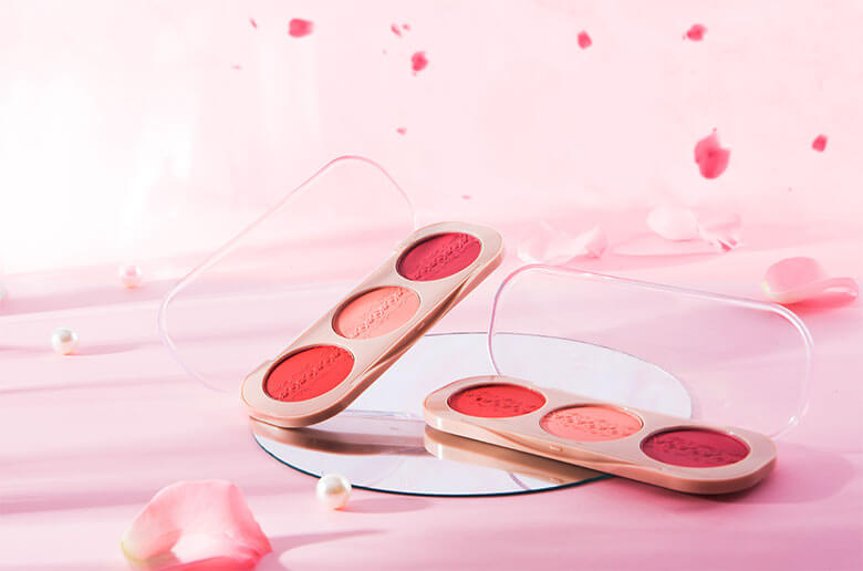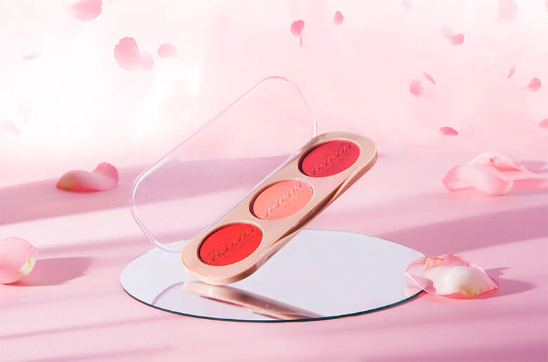 花漾三色腮紅盤,以春日花瓣為靈感,將三種適配亞洲膚色的腮紅色調,融于精致雕花設計